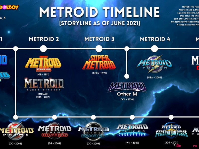 Впринципе удалось найти более менее ясную картинку с порядком игр с точки зрения лора. Только сейчас  немного с поправками - Metroid Prime 4 уже вышла в 2025 году, ну и точно неизвестно, в какой временной отрезок её можно определить.