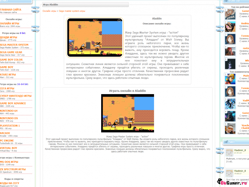 Игра AladdinОнлайн игры » Sega master system игры AladdinОписание онлайн игры: Жанр Sega Master System игры - "action"Этот удачный проект выполнен по популярному мультфильму "Аладдин" от Walt Disney. Вы играете роль небогатого парня, вся жизнь которого сплошное приключение. Чтобы как-то выжить, ему приходится воровать пищу. Кроме Аладдина, здесь так-же можно увидеть других известных по мультфильму героев. Многие из них помогают ему в затруднительных ситуациях. Сюжетная линия является сильной стороной этой игры. Она привязывает к себе интересными событиями. Аладдину придётся убегать от охраны, проходить различные ловушки и многое другое. Графика игры просто отличная. Качественная прорисовка радует глаз яркими красками. Знакомые локации должны обязательно понравиться поклонникам мультфильма. Сразу видно, что здесь работали опытные люди. Реклама Играть онлайн в Aladdin Жанр Sega Master System игры - "action"Этот удачный проект выполнен по популярному мультфильму "Аладдин" от Walt Disney. Вы играете роль небогатого парня, вся жизнь которого сплошное приключение. Чтобы как-то выжить, ему приходится воровать пищу. Кроме Аладдина, здесь так-же можно увидеть других известных по мультфильму героев. Многие из них помогают ему в затруднительных ситуациях. Сюжетная линия является сильной стороной этой игры. Она привязывает к себе интересными событиями. Аладдину придётся убегать от охраны, проходить различные ловушки и многое другое. Графика игры просто отличная. Качественная прорисовка радует глаз яркими красками. Знакомые локации должны обязательно понравиться поклонникам мультфильма. Сразу видно, что здесь работали опытные люди. ВконтактеОдноклассникиМой мирFacebookTwitterОценка: 4 1 2 3 4 5 (голосов: 4) Играли: 7570 Дата: 2020-06-16 14:30Скачать игру "Aladdin"нет игры для скачивания / Как сохранить игру и тех. вопросы Предыдущая игра: Aerial Assault Следующая игра: Alex Kidd in Miracle World Играть в похожие игры Играть Dungeons & Dragons: Tower of DoomЧто можно сказать об этой игре, только то, что она необычная. Необычность заключается в том, что здесь представлен сайдскроллинговый beat'em up, приправленный элементами RPG. Если говорить конкретнее, то здесь есть выбор предметов, собранных на каждом уровне, диалоги с прохожими, после чего следует выбор пути. Что касается beat'em up-составляющей, то здесь ничего не потеряно, все как положено: удары, захваты, различное оружие. Подводя итоги,Играть онлайн в "Dungeons & Dragons: Tower of Doom". Играть Croc 2В игре Croc 2 на PS1 тебе предстоит вновь отправиться в увлекательное приключение вместе с нашим любимым крокодилом. На этот раз у тебя будут новые уровни, занимательные головоломки, захватывающие битвы и новые друзья - Гоббо. Ты снова спасешь этот милый народ от злых сил исследуя различные локации, собирая предметы и борясь с врагами. Графика игры порадует глаз, богатая цветовая палитра и детально проработанные уровни создадут впечатлениеИграть онлайн в "Croc 2". Играть Disney's HerculesDisney's Hercules на PS1 - это захватывающее приключение, основанное на популярном мультфильме студии Disney. В этой игре ты взберешься на Олимп, сразишься с мифическими существами и даже поборешься с самим Аидом. Геймплей сочетает в себе элементы платформера, экшена и головоломки, так что тебе точно не будет скучно. Графика игры красочная и яркая, в стиле классических диснеевских мультфильмов, что добавляет веселья и атмосферности. ПриятнымИграть онлайн в "Disney's Herc